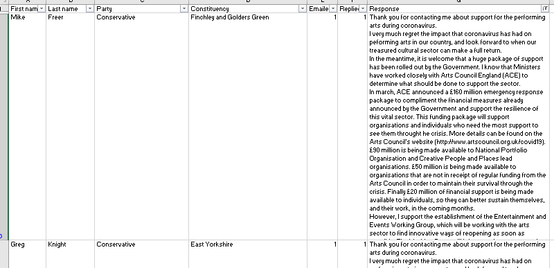 As the responses from the public and MPs start coming in, help yourself by logging who has been sent a letter and who has responded to one. This is especially useful when comparing who is replying with the same phrases. You can get a quick download here. By spotting these patterns we can quickly highlight gaps in knowledge, and tackle any disinformation taking place. This was a crucial part of this campaign, and allowed me to help people push their MPs further.