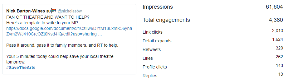 Many folk will reach out with questions about some of the issues raised in the template, especially when you have included your contact details. That’s more than okay – what’s lobbying if it isn’t education? By bringing in people from outside The Industry we are going to have to fill in some blanks. You might consider opening your DMs for people to reach you quickly. Most of my questions were about why theatre was suffering, or hadn’t been funded, and whether the government had already given us lots of money? I encourage you to respond as compassionately and caringly as possible to these: the worst thing we can do is get defensive or impatient. One newly-understanding theatre-fan can lead to ten newly-understanding friends-of-fans very quickly.