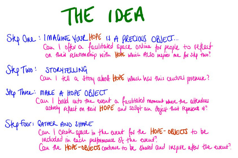 As I approach the first moment where the work meets the world in some form, I took stock today, Friday 30th October, to consolidate my thoughts so far in the project. It has seen me shift from two to one day a week, meet challenges of working as a collaborative theatre maker now working alone, self-isolation, and, of course, no access to theatre spaces in this project. Hope is a very present part of all our lives now, whether we are aware of not, and when working with it it’s hard to know quite how the real world will affect it.